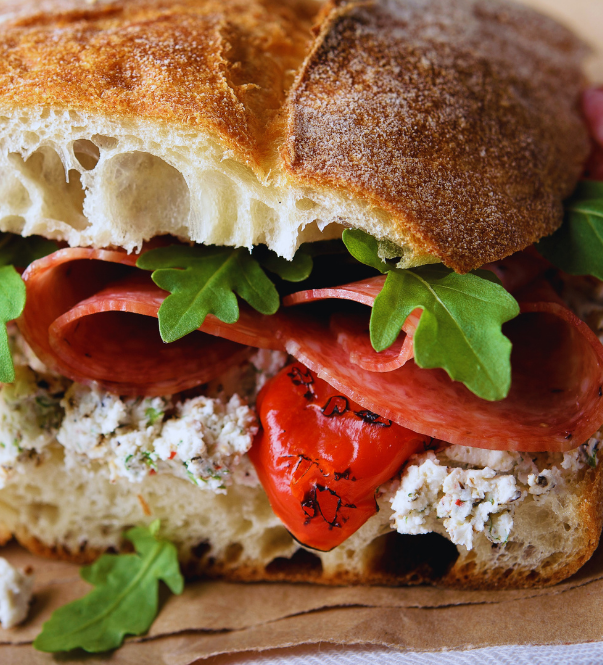 Carne, queso mozzarella, queso cheddar, cebolla, pepinillos, mayonesa y mostaza en pan ciabatta.