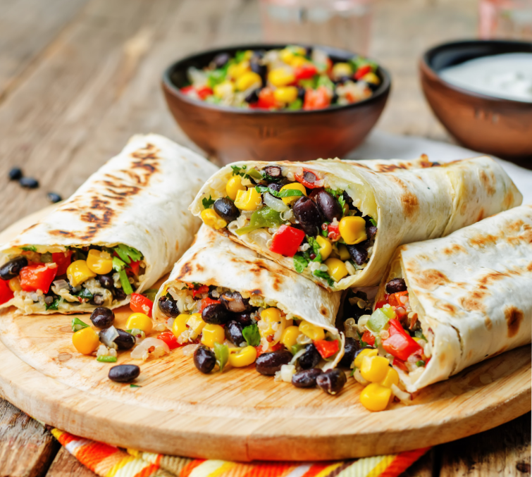 Arroz con pasas, letejas al curry, mix de hojas verdes, cilantro, pepino, rábanos, tortilla integral y salsa.
